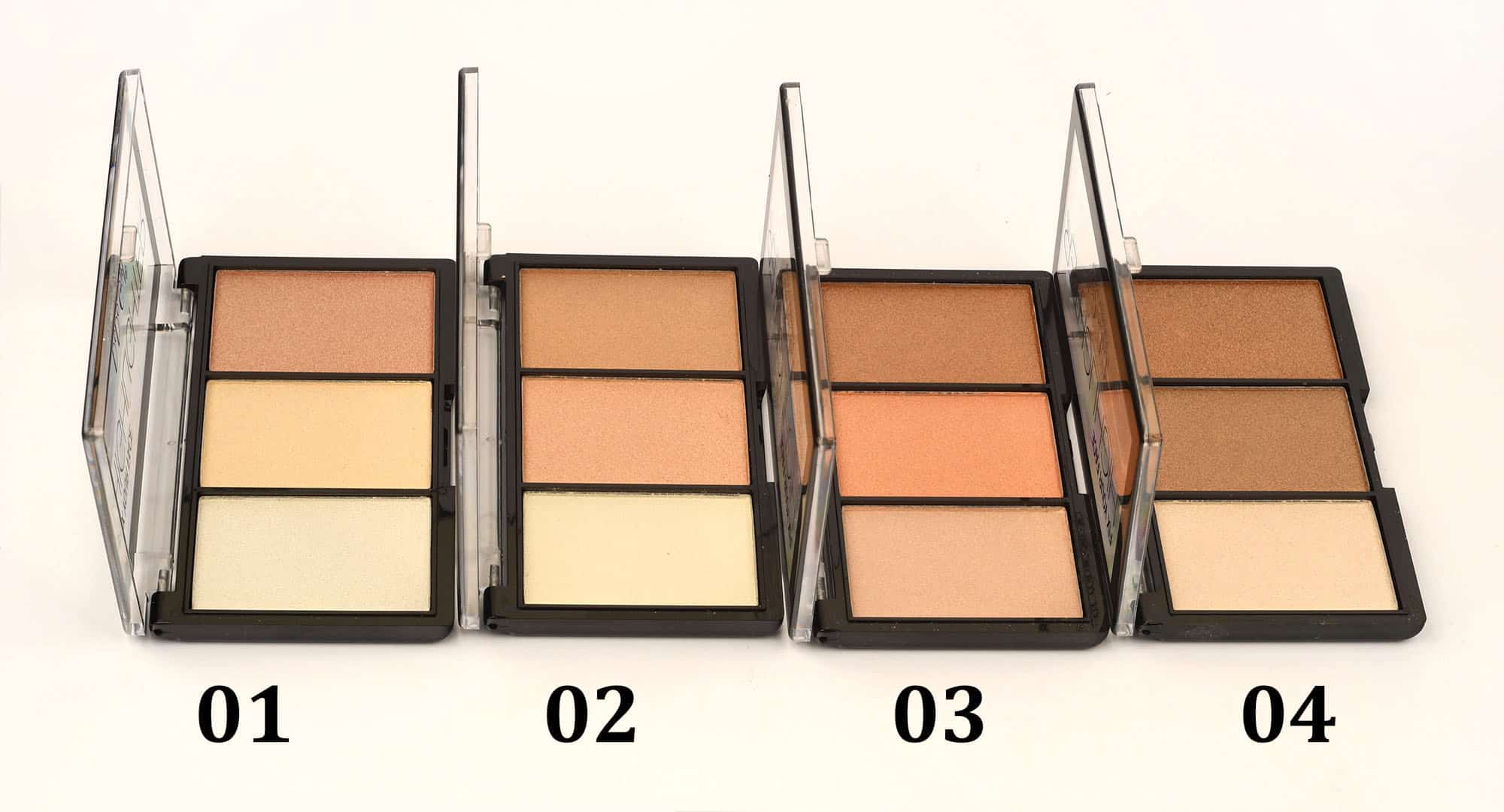 • این هایلایتر شامل سه رنگ مختلف است که می‌توانند به تنهایی یا با هم استفاده شوند. این رنگ‌ها معمولاً شامل طیف‌های طلایی، نقره‌ای و برنزی هستند که برای انواع تناژهای پوستی مناسب‌اند.